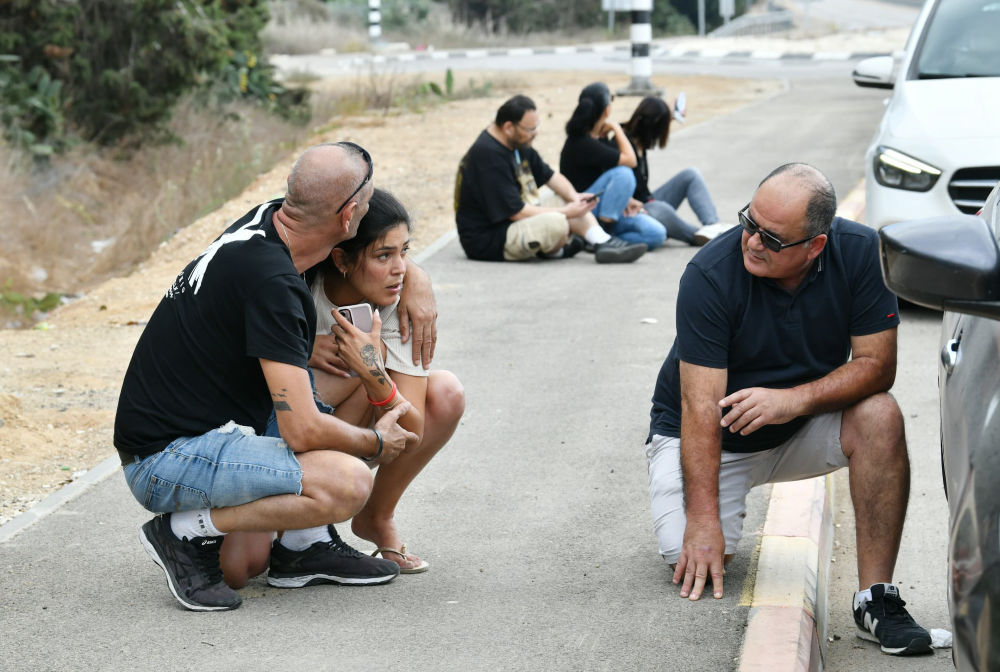 ↑10月12日,以色列南部城市斯代罗特,居民在火箭弹袭击中避险。新华社/基尼图片社