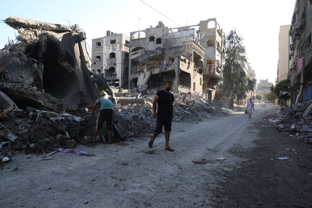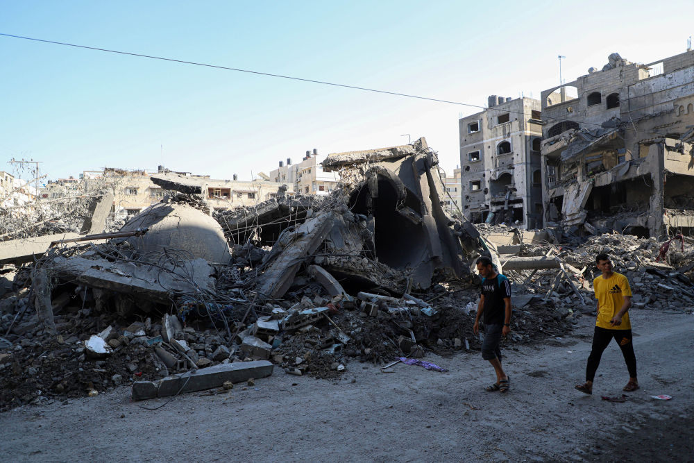 ↑10月12日,在加沙城,人们走过被以色列军队空袭炸毁的建筑。新华社发(里泽克·阿卜杜勒贾瓦德摄)