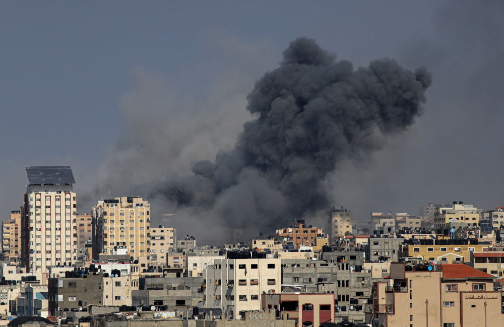 ↑10月12日,加沙城的建筑遭以色列军队空袭后升起浓烟。新华社发(里泽克·阿卜杜勒贾瓦德摄)