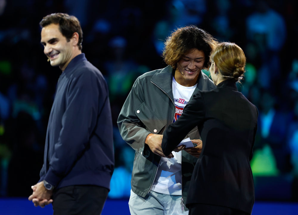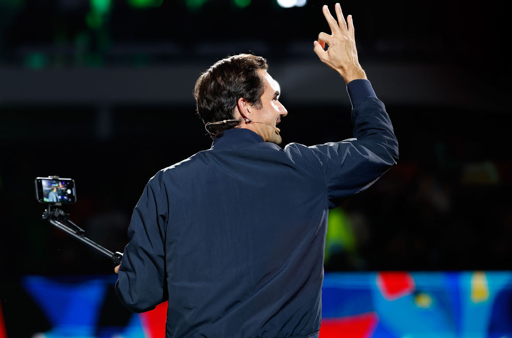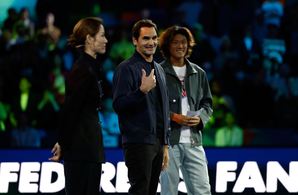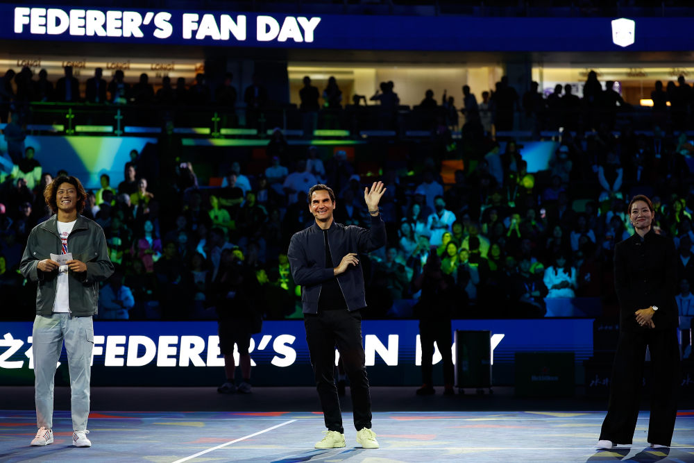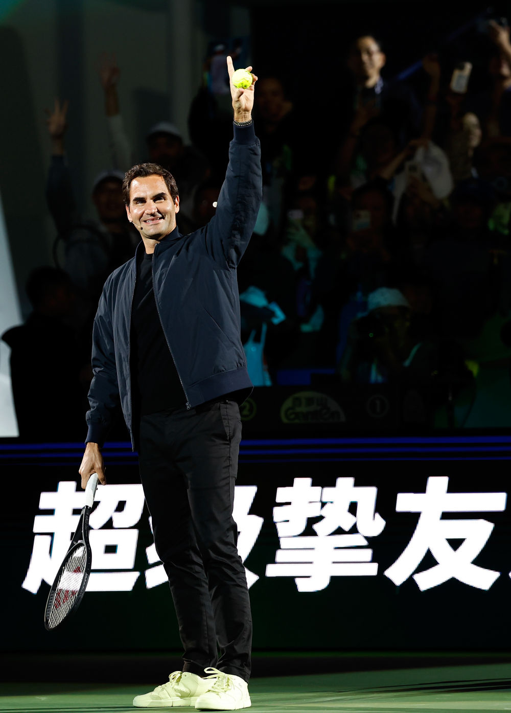 10月13日,退役瑞士网球名将费德勒在2023年ATP上海网球大师赛的中心球场亮相,参加“超级挚友之夜”活动。