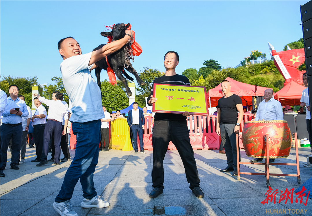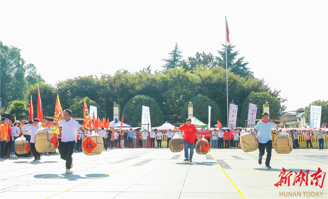 “滴……”随着一声哨响,担谷大赛正在广场中央上演,来自8个家祠的117位农民队员担上新收的稻谷,在赛道上往返。除了担谷子,还有独轮车运粮、滚南瓜等比赛,一项项趣味运动聚集了人气,也增添了丰收节日的喜庆氛围……“秋收尝新是湘赣边传承百年的民俗,我们本地的家祠每年都会在这个时节开展庆丰收活动。”蔺氏家祠的蔺代洪说道。
