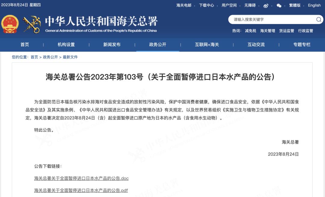 根据中国海关总署当天晚些时候发布的公告,依据中国法律法规和世界贸易组织相关规定,中国海关总署决定自2023年8月24日(含)起全面暂停进口原产地为日本的水产品(含食用水生动物)。
