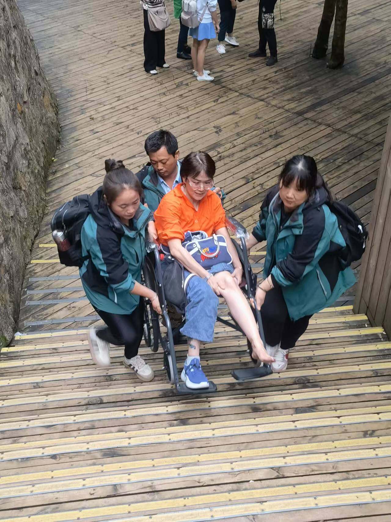 来自广东的孙红女士,是一位患有腿疾的残疾人,她一直渴望到张家界大峡谷的玻璃桥上看一看。当她和孩子来到景区后,面对高高低低的台阶,却有些傻眼了——孩子力气不够,根本就背不动她。正当她和孩子一筹莫展之时,景区安排“红石榴”志愿服务队前来“助阵”,带着轮椅又推又抱地带着她来到了玻璃桥上。