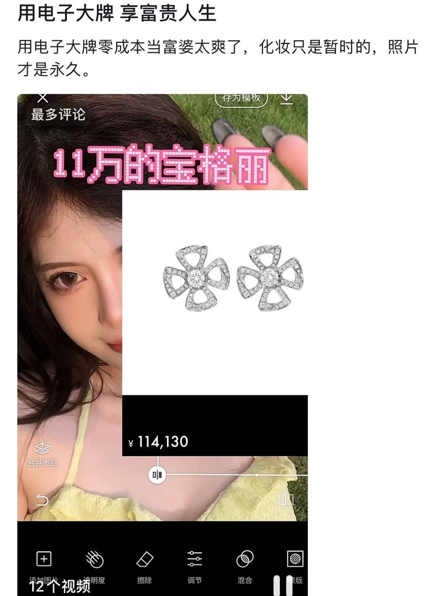 打开社交媒体,“电子大牌”已被网友们用出各种花样。数十万元的梵克雅宝全钻项链,宝格丽的彩色宝石耳环,纷纷被抠图后再“戴”到网友们身上,各类名牌包袋、名酒豪车,也纷纷成为照片中的“配置”。有人传授经验让大家要到品牌官方网站和旗舰店截图,“即使是电子大牌,也要用正品、支持原版”。近日热衷此道的销售行业从业者沈翊然表示除了图片清晰之外,“很多官网为清楚展示商品本身就去掉了背景,用起来更方便。”