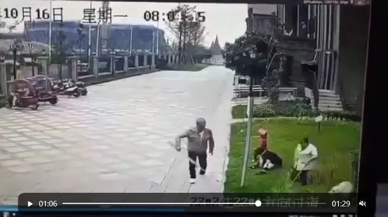 ▲女童遭烈犬撕咬后,邻居和保洁人员试图驱赶烈犬。 网传视频截图