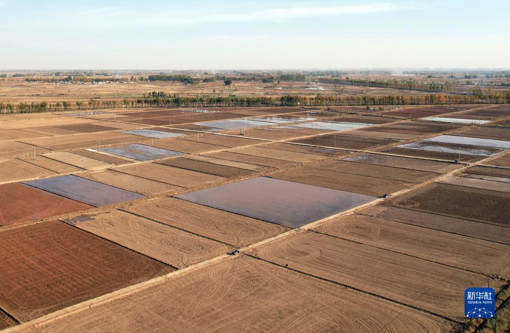 10月18日,内蒙古巴彦淖尔市临河区白脑包镇胜利村村民在进行秋季灌溉(无人机照片)。新华社记者 李云平 摄