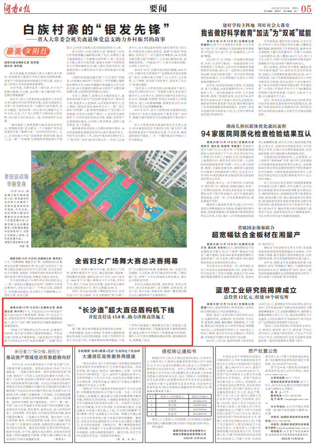 湖南日报•新湖南客户端10月19日讯(记者 陈新 通讯员 钟行利) 今天上午,开挖直径达13.8米的国产超大直径泥水平衡盾构机“津城1号”在长沙下线。该盾构机将用于津潍高铁津沽海河隧道掘进施工,助力“八纵八横”高速铁路网京沪辅助通道和沿海通道建设。