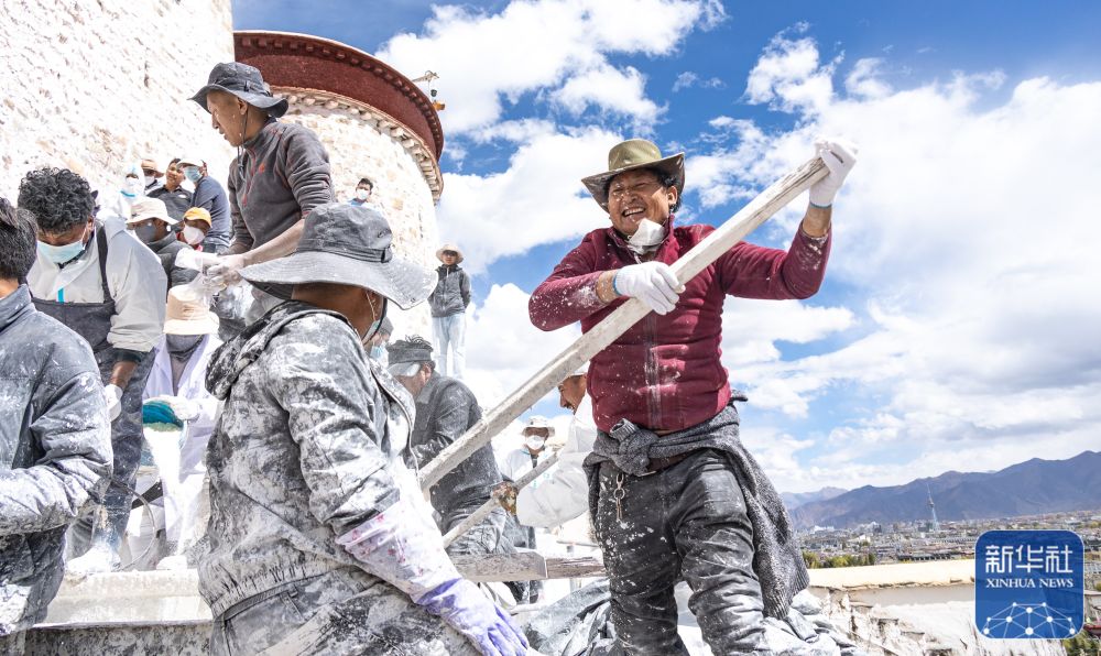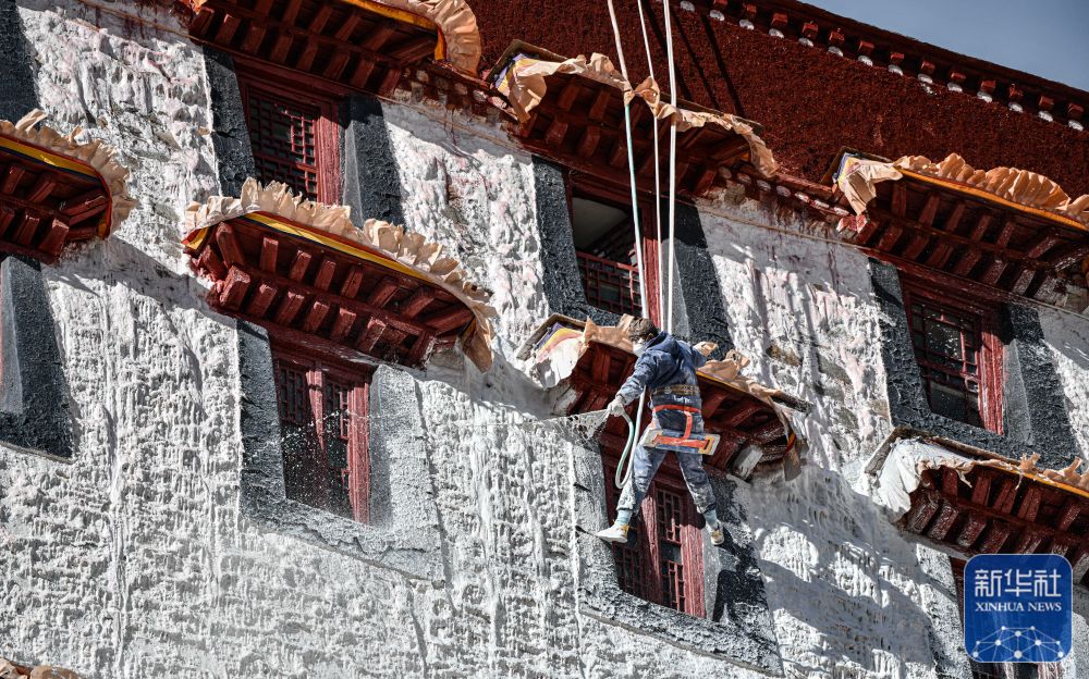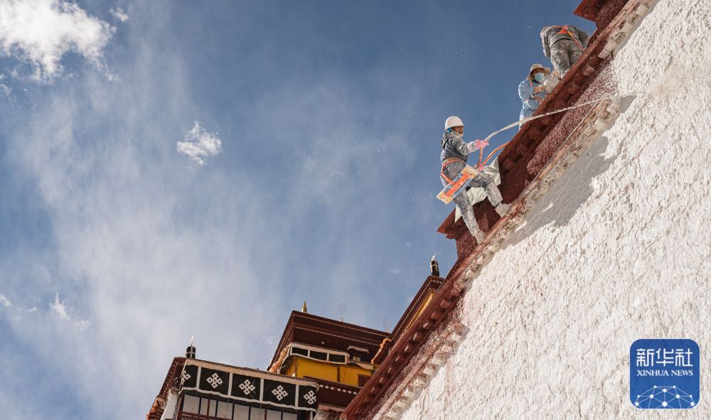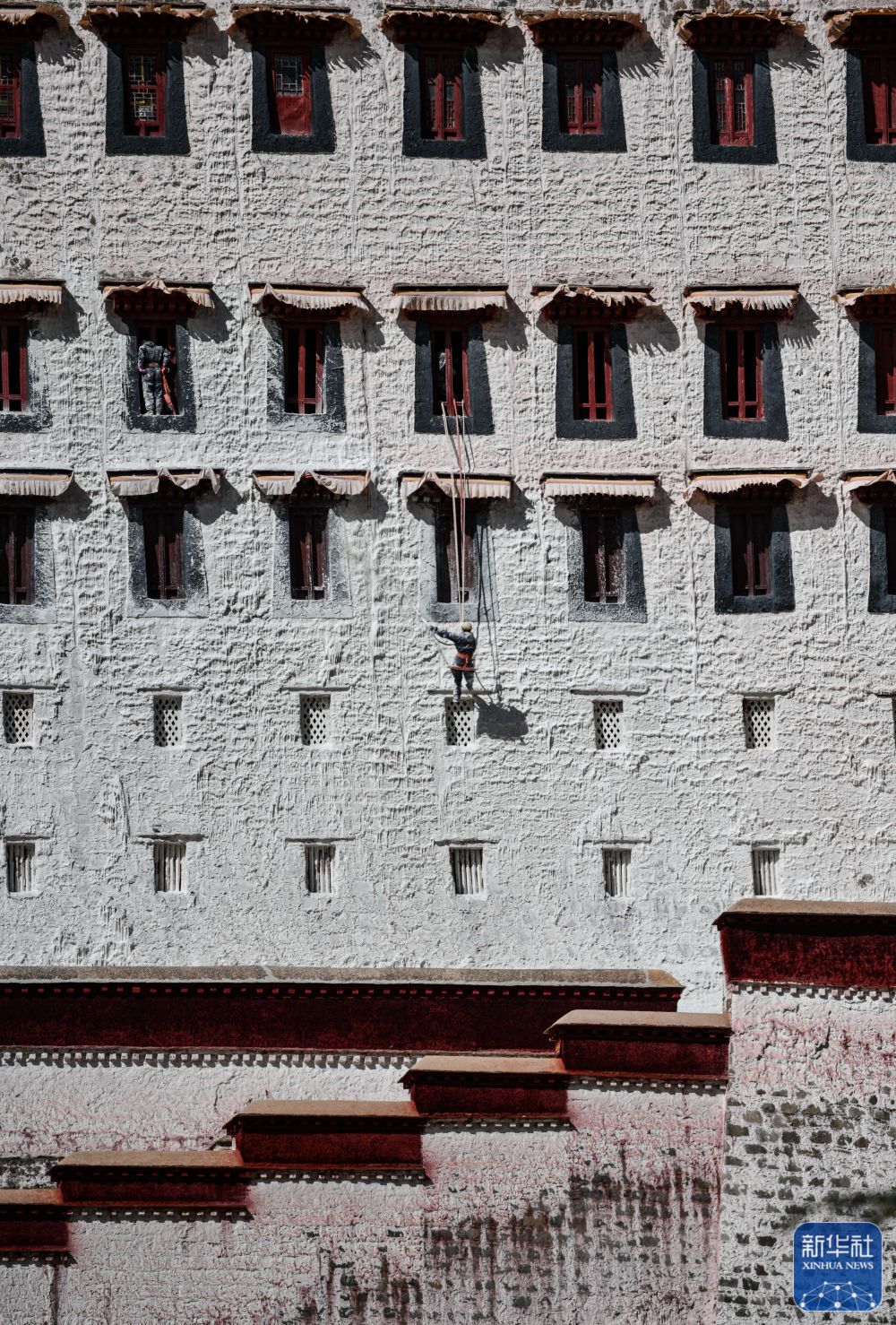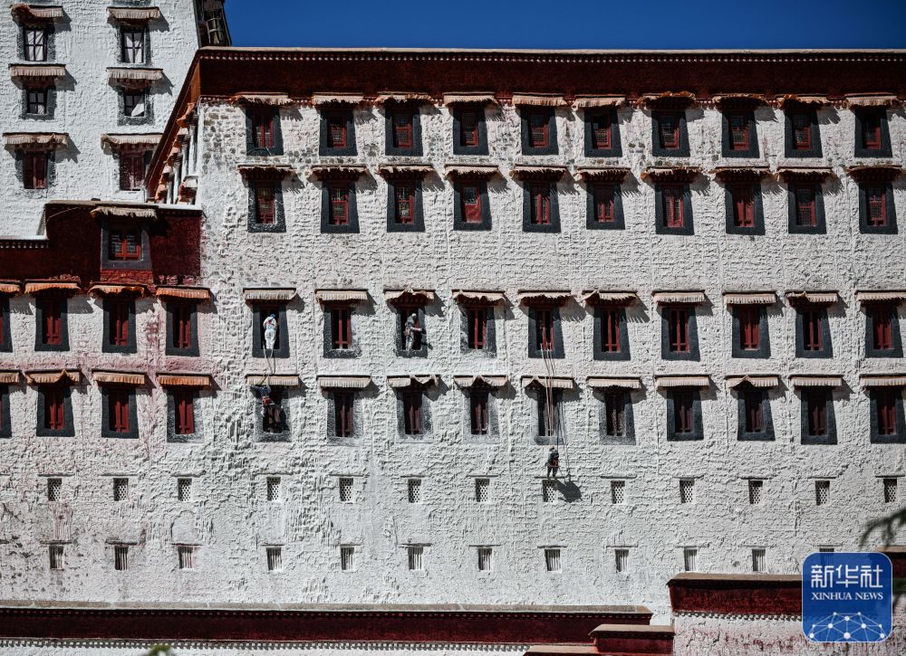 近日,西藏布达拉宫开始进行粉刷维护工作。为使经过一年日晒雨淋的红墙白壁保持鲜亮光彩,每年秋冬交替时节,布达拉宫外墙都要进行粉刷“美容”。