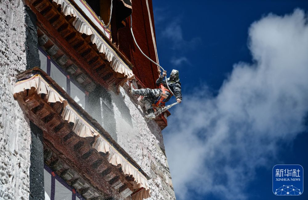 ↑工作人员对布达拉宫外墙喷洒涂料(10月18日摄)。