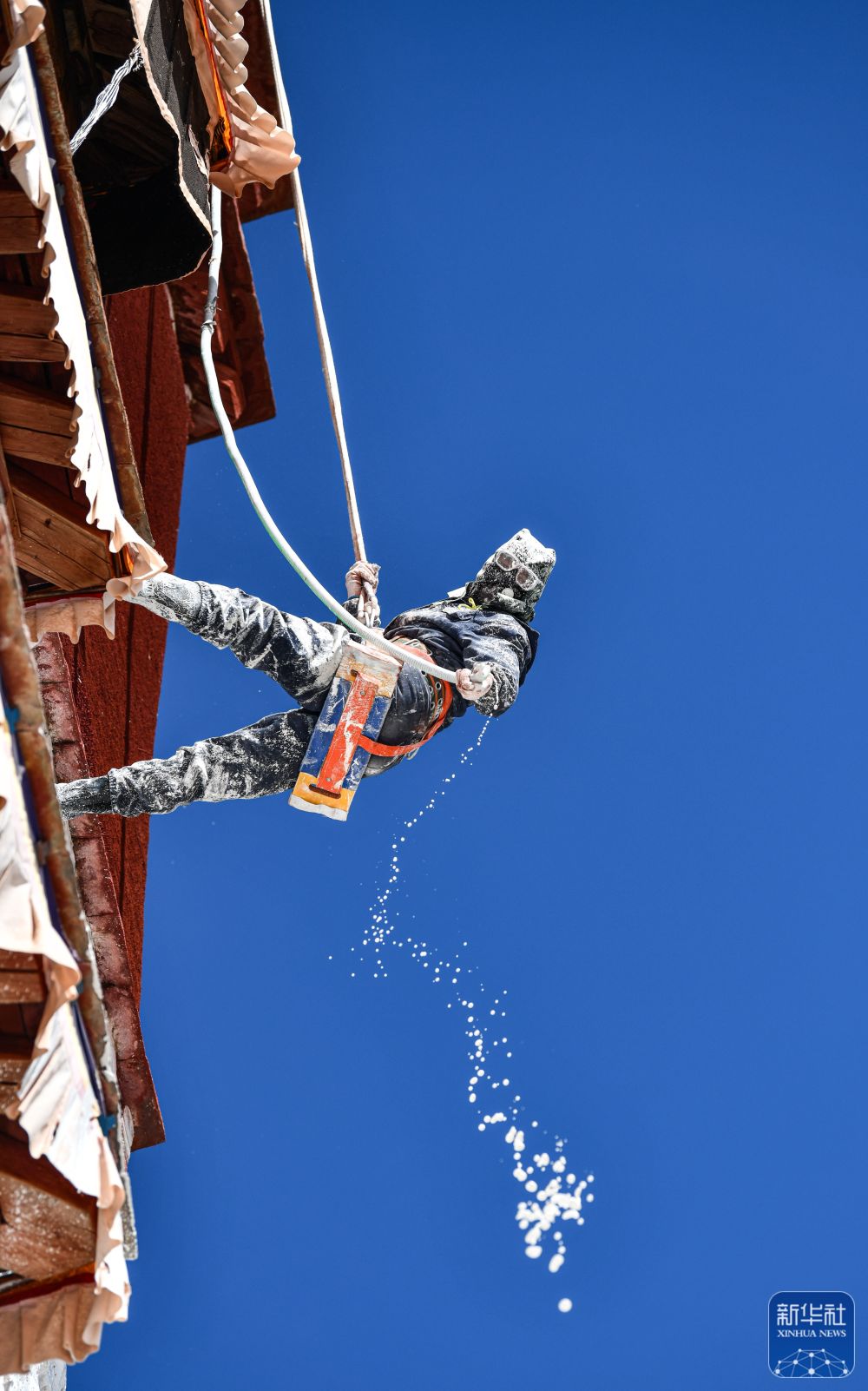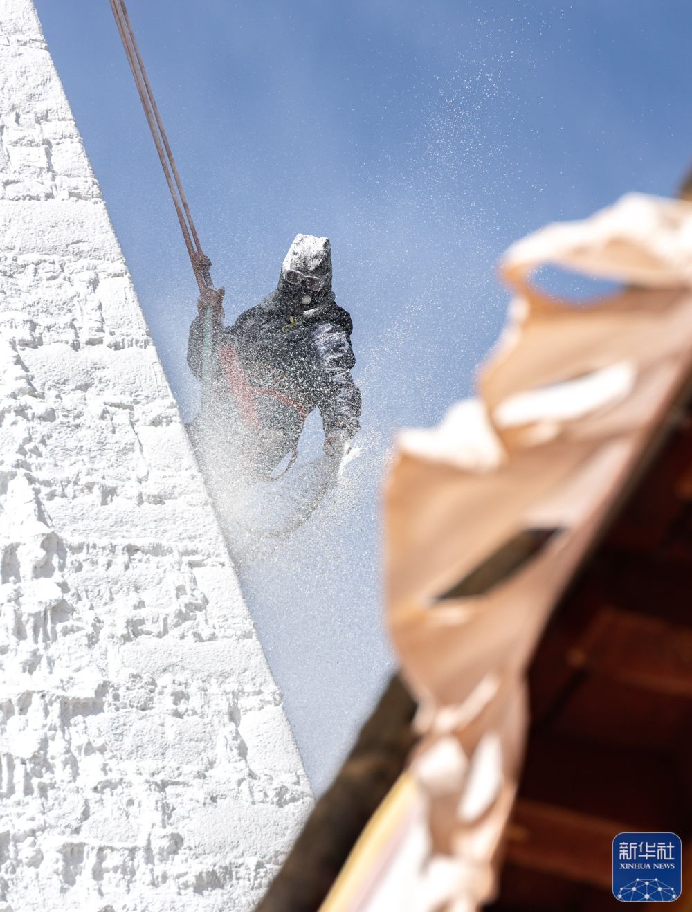 ↑工作人员对布达拉宫外墙喷洒涂料(10月19日摄)。