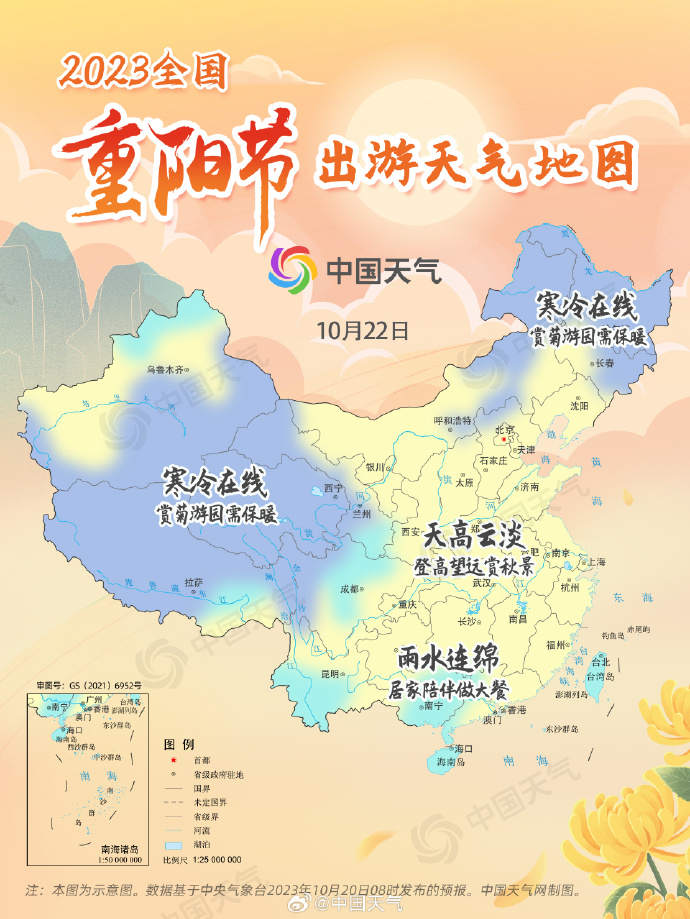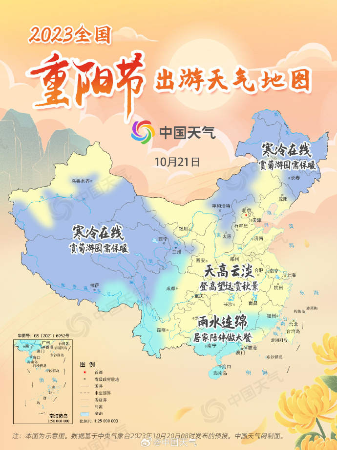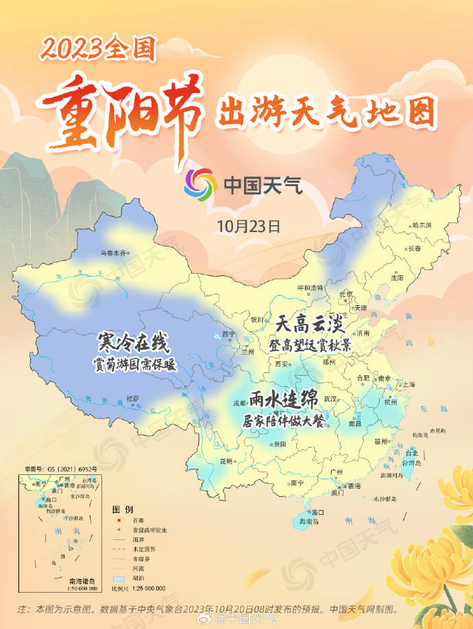 周六,京津冀、陕西、山东、河南、安徽、江苏、浙江、上海、湖北、湖南中北部、重庆、贵州、江西中北部以及福建北部、台湾等地天高云淡,非常适宜登高出游,大家可以陪着老人登高山、高楼,在高处欣赏五彩斑斓的秋景;吉林、黑龙江、新疆、西藏、青海等地气温较低,当地朋友如果想陪长辈外出游园赏菊,需要做好防寒保暖措施,避免感冒;而广东、广西、海南等地雨水频繁,小伙伴不妨在家陪陪长辈,制作暖心餐,宅家享受团聚之乐。
