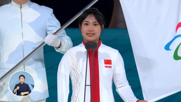蒋裕燕穿着合体的领奖服,代表运动员宣誓。