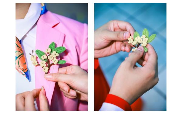 除了礼服,每一名中国运动员还收到了一份特别的礼物,那就是一枚“金枝折桂”的胸针。这是由“美丽工坊”30 多名残疾女性耗时两个多月手工制作完成的,寓意祝福中国运动员自信上场,勇夺桂冠。