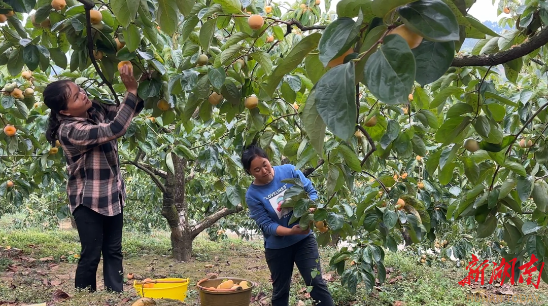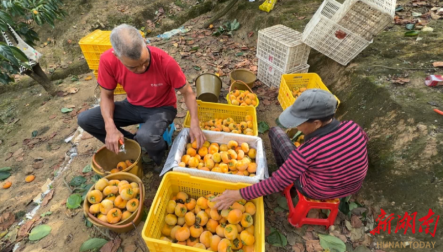 湖南日报·新湖南客户端10月23日讯(通讯员 周文 谢文彬 谭兆艳)又是一年丰收季,好“柿”成双满枝头。近日,江永县千家峒瑶族乡凤岩山村500多亩月柿陆续成熟上市,当地果农们忙着采摘、装筐。