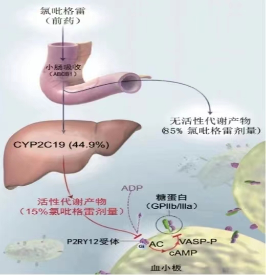 氯吡格雷是一种前体药物,需要经过肝药酶CYP2C19代谢后方能产生抗血小板作用。有研究显示,在中国人群中,CYP2C19基因存在着多种变异,进而对药物代谢产生影响。根据药物代谢快慢,分为快代谢型、中间代谢型与慢代谢型,而后两种代谢类型(在我国人群中,占比近60%)表明服药后疗效差,研究表明有一部分人对阿司匹林也会产生耐药性,故不测基因型而直接使用氯吡格雷或阿司匹林,可能导致即使按时服药,仍然出现再次梗死的现象。