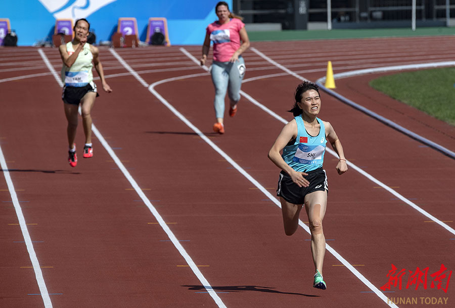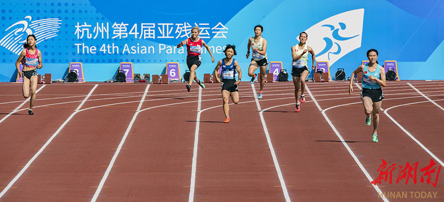 10月23日10时许,杭州第4届亚残运会首个比赛日,湘籍运动员史逸婷在女子200米T36级决赛中以28秒17的成绩夺得金牌,并刷新了自己28秒21的世界纪录,为我省夺得本届亚残运会的首金。图为史逸婷(右一)在比赛中。 湖南日报全媒体记者 李健 摄