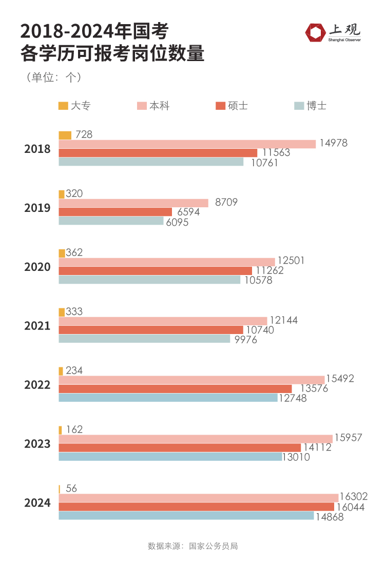 历年国考职位表显示,自2018年至2024年,大专学历可报考的职位占总职位的比例从2.6%下降至0.1%。这意味着,对于大专生来说,国考已不再是对学历相对友好的“战场”。