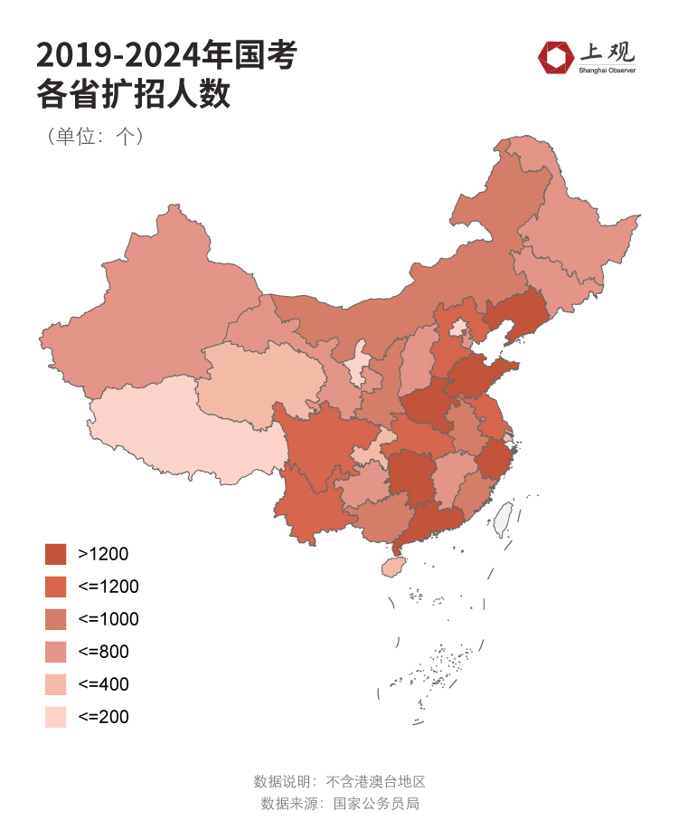 而在不同省份,国考的扩招、竞争情况也有些许的差别。