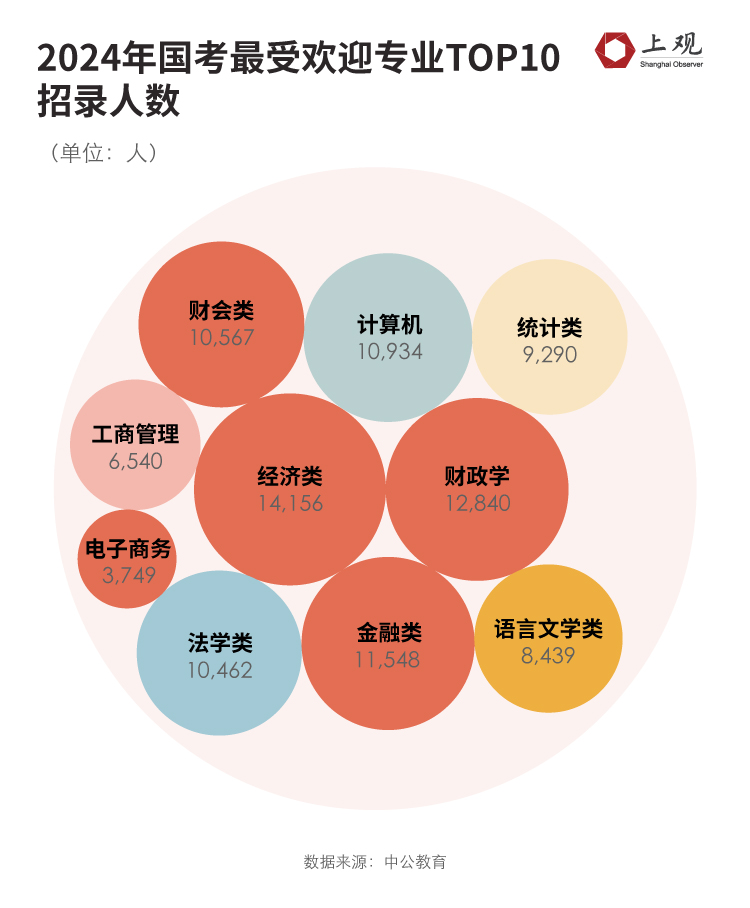 2024年国考中,经济类、财政学、金融类、计算机、财会类、法学类、统计类、语言文学类、工商管理和电子商务占据前十。
