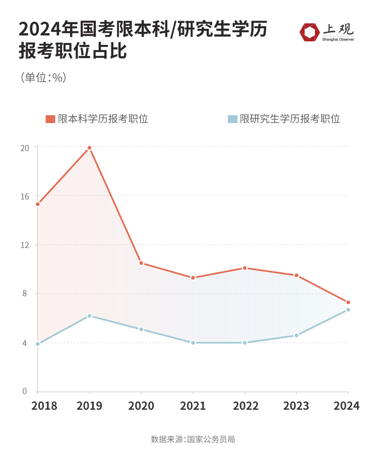 相较之下,仅限研究生学历可报的职位占比整体提高了。