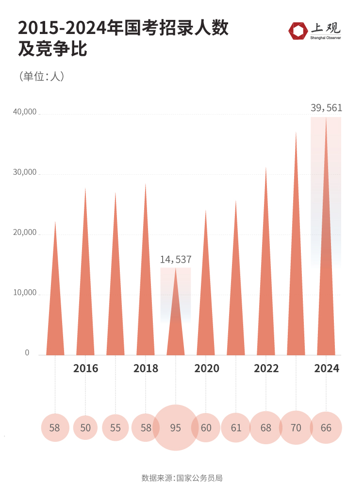 此后几年,报录比逐年提高,2023年达到1:70,平均每个岗位多了10个人竞争。