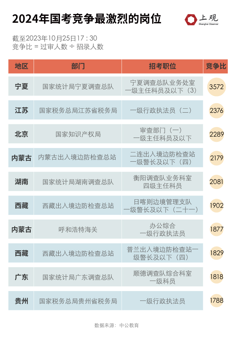 中公教育数据显示,截至10月24日17时30分,竞争最激烈的岗位是国家统计局宁夏调查总队的“宁夏调查总队业务处室一级主任科员及以下(3)”,3572人争夺1个岗位。