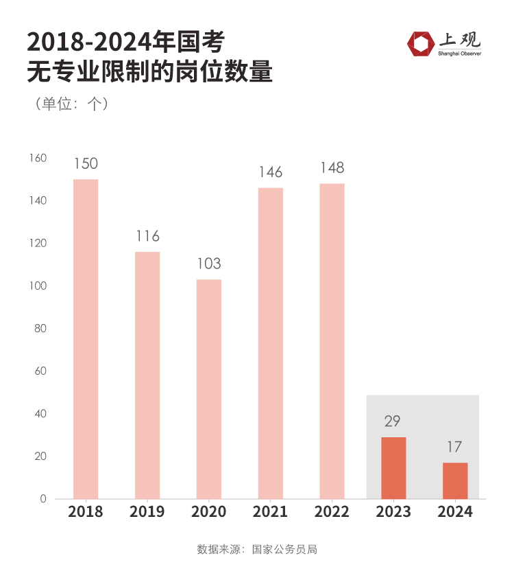 国考中最受欢迎的“三不限”岗位,最重要的特征之一就是不限专业。然而,官方数据显示,2023、2024年分别只有29、17个无专业限制的职位。