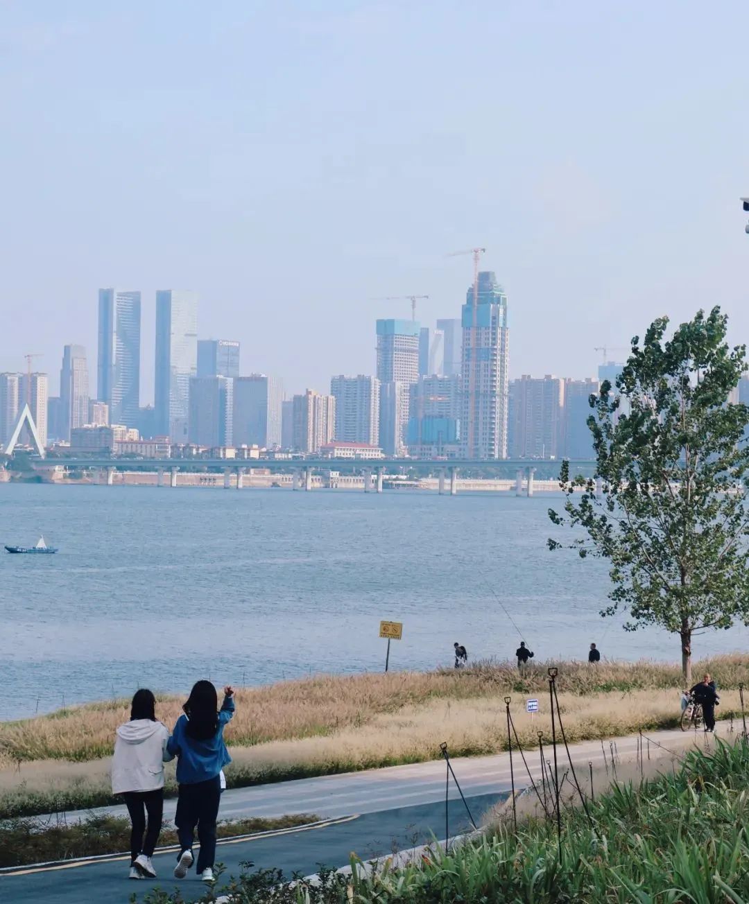 淡黄的狗尾巴草和蓝色江岸线重叠交错