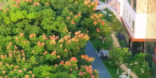 金黄的栾花、红色的果实,与绿叶交相辉映