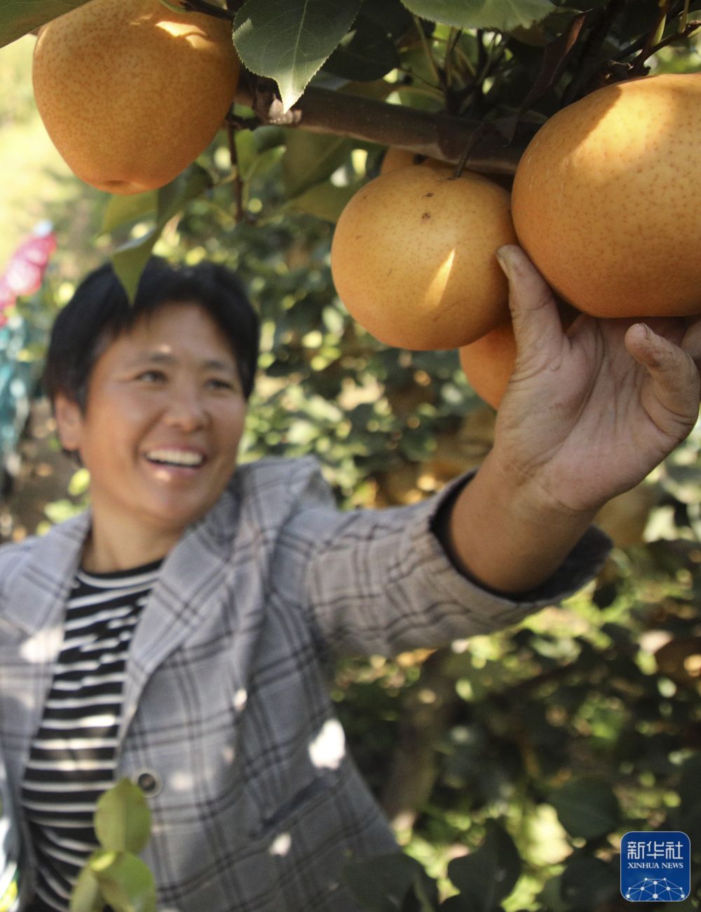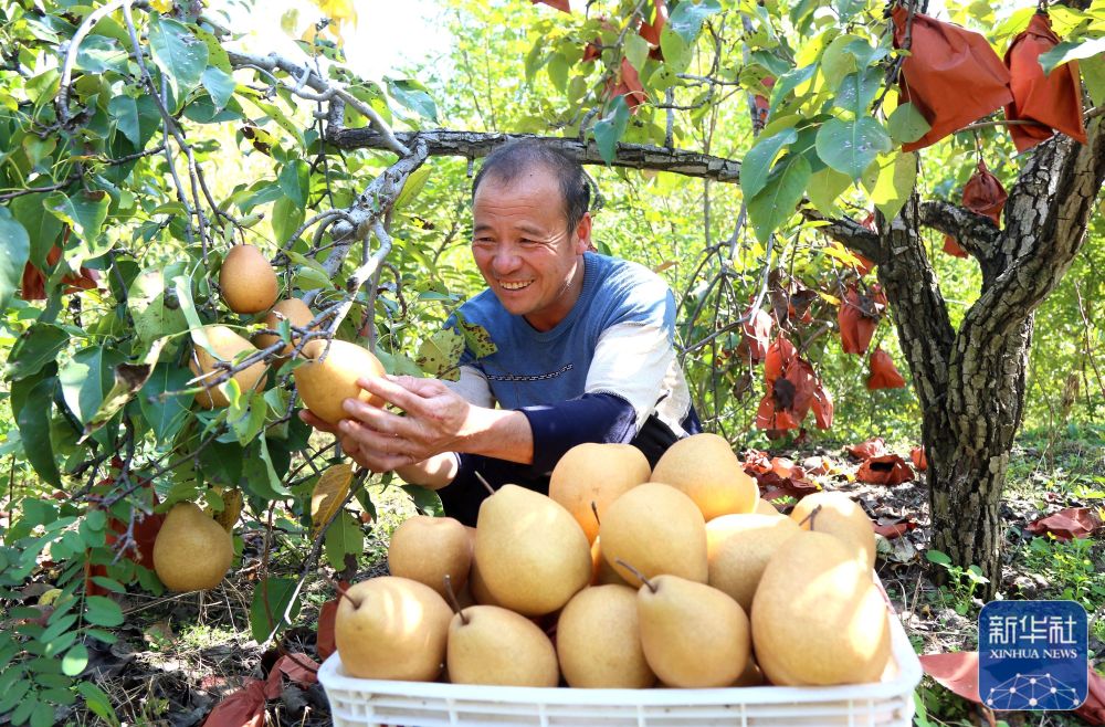 10月9日,在河北省邯郸市广平县平固店镇南下堡村晚秋黄梨种植基地,农户在采摘成熟的晚秋黄梨。新华社发(程学虎 摄)