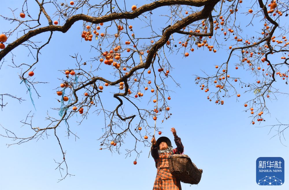 10月24日,山东省淄博市沂源县石桥镇分水新村的农民在采收柿子。新华社发(赵东山 摄)