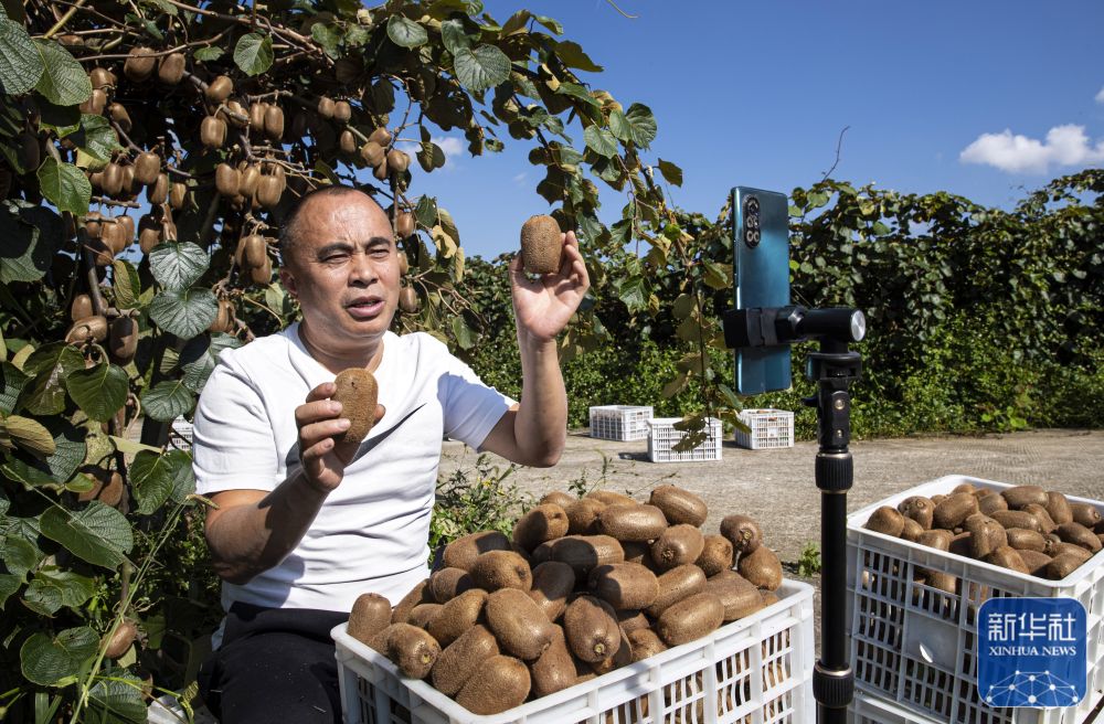 10月16日,村民在贵州省黔西市林泉镇海子社区生态农业园直播销售猕猴桃。新华社发(史开心 摄)