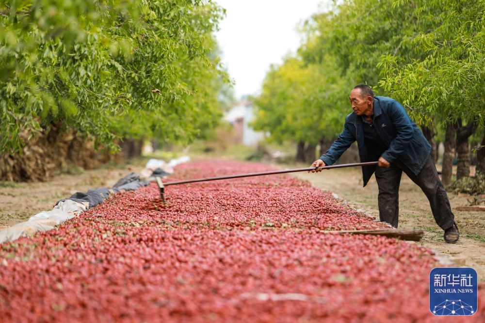 10月7日,山东省乐陵市朱集镇后朱村枣树合作社社员在晾晒小枣。新华社发(贾鹏 摄)