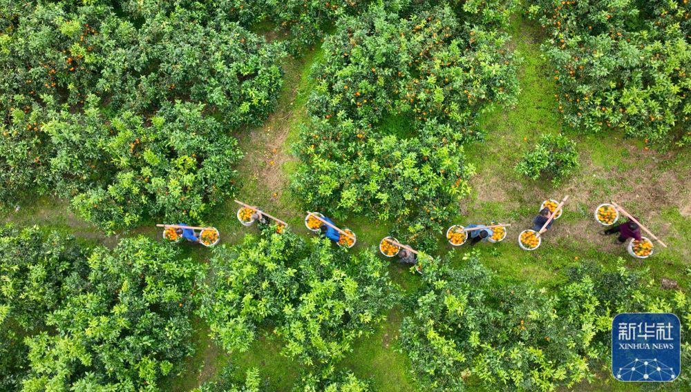 10月24日,四川省成都市双流区永安镇梨园村柑橘种植基地工作人员在装运成熟的柑橘(无人机照片)。新华社发(李向雨 摄)
