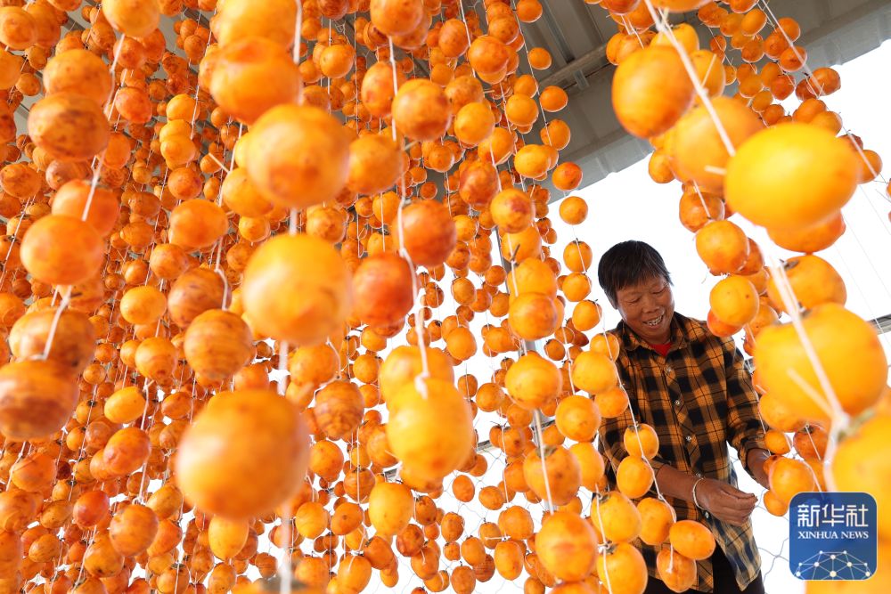 10月22日,村民在山东省枣庄市山亭区北庄镇双山涧村晾晒柿子。新华社发(刘明 摄)