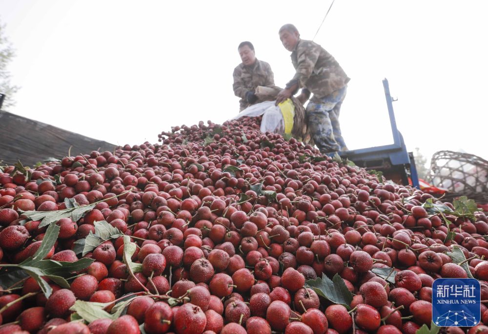 10月25日,农民在河北省遵化市一家山楂专业合作社堆放收购的山楂。新华社发(刘满仓 摄)