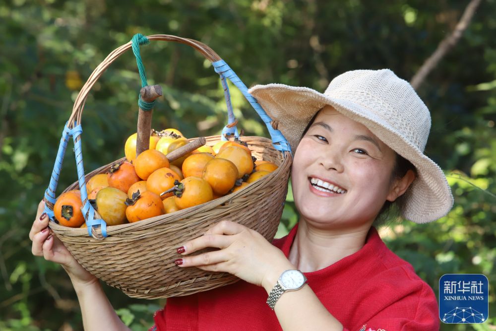 10月24日,在浙江省台州市路桥区峰江街道白枫岙村,村民展示采摘的柿子。新华社发(蒋友青 摄)