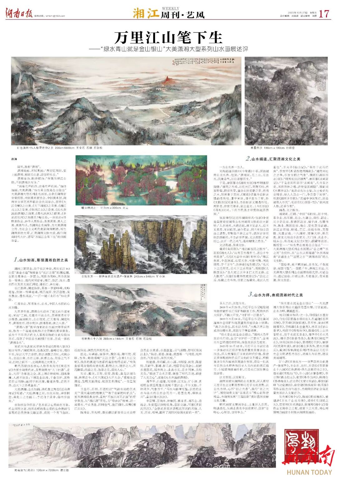 湖南画家从湖南的山水出发,深入贯彻习近平生态文明思想和习近平文化思想,以山水为师,心怀“国之大者”,践行“省之大计”,围绕湖南文旅“五张名片”精心创作出精品,为湖南实现“三高四新”美好蓝图贡献文化力量。