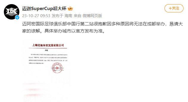 10月27日,梅西中国行举办方再次宣布,“成都站因多种因素无法举办,具体举办城市以官方发布为准。”此外,针对网络出现的关于梅西中国行成都站活动相关信息,活动主办方也回应称,“目前关于2023年11月8日梅西中国行成都站迈阿密国际对战蓉城俱乐部相关比赛的时间、地点、赛程、票务信息均为不实信息。请广大球迷群众以本公司信息发布为准。”