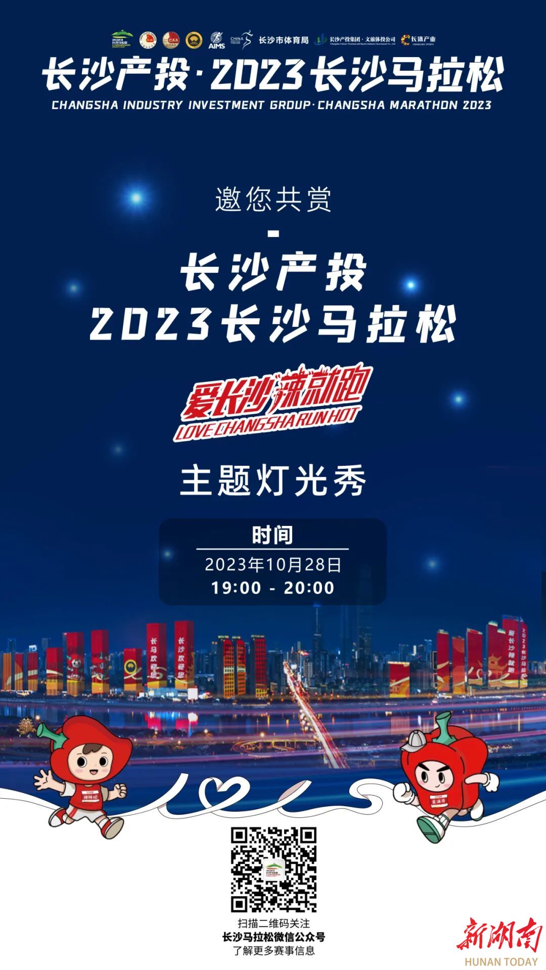 湖南日报·新湖南客户端10月28日讯(记者 陈普庄 蔡矜宜)记者从长沙产投·2023长沙马拉松组委会获悉,今天19:00—20:00,长沙马拉松主题灯光秀将盛大亮相一江两岸,用延绵20余公里的璀璨之光,点燃奔跑热情,照亮星城之夜。