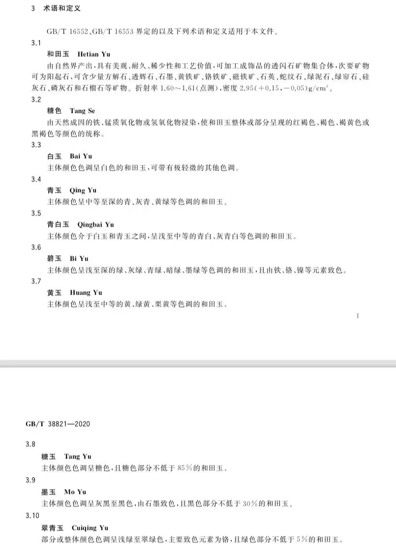 目前,和田玉行业最新的国标,是由国家市场监督管理总局、中国国家标准化管理委员会发布的GB/T 38821-2020《和田玉鉴定与分类》标准(简称“2020标准”),发布于2020年6月。其中对和田玉的矿物成分描述为:“主要由透闪石组成,次要矿物可为阳起石,可含少量方解石、透辉石、石墨、黄铁矿、铬铁矿、磁铁矿、石英、蛇纹石、绿泥石、绿帘石、硅灰石、磷灰石和石榴石等。”
