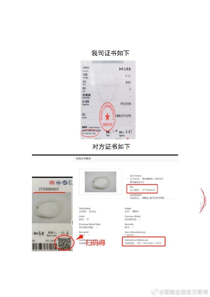 在最新声明中,鸳鸯金楼表示,对于公司复检证书合规性做出如下声明:公司复检证书和对方复检证书均使用国家和田玉检测标准GB/T 16552-2017与GB/T 16553-2017(主要成分为透闪石即可根据宝石名称规格命名为“和田玉”),均具有中国合格评定国家认可委员会CNAS的能力认证。