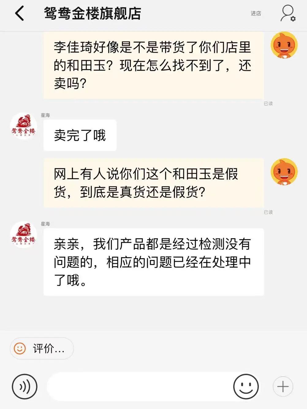 据记者查询鸳鸯金楼天猫旗舰店,发现已经没有相关和田玉产品在售。店铺客服回应记者称,产品已经卖完了,并表示相关产品都经过检测,没有问题,相应问题已经在处理中。同时,记者拨通了公司官网电话,长期处于无法接通状态。