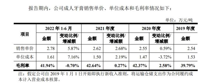 登康口腔旗下拥有冷酸灵等品牌,其招股书显示,2019年至2021年,公司成人牙膏的单位成本分别为1.53元、1.47元以及1.50元。