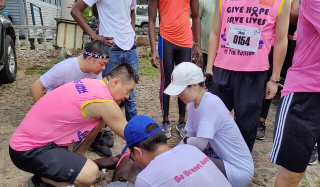 医疗队副队长张磊屹迅速取来急救箱,龙检、韦迪两位护士对患者进行生命体征监测。内科易善清副主任医师考虑患者可能是剧烈运动后急性脱水、电解质失衡、心律失常,让患者口服补液补充电解质,及抗心律失常、护心药物;医疗队廖海燕老师则及时将提前准备好的运动补充能量食物给患者食用。
