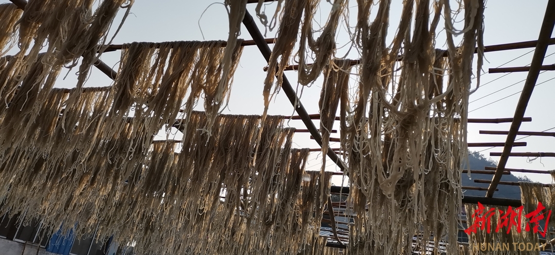 时至霜降,红薯成熟。南岳坪村景星农产品种植专业合作社生产车间,制粉师傅麻利地打粉磨浆、蒸煮、上挂、轧粉条……一排排青褐色的红薯粉整齐地挂在竹竿上晾晒,散发浓浓薯香。
