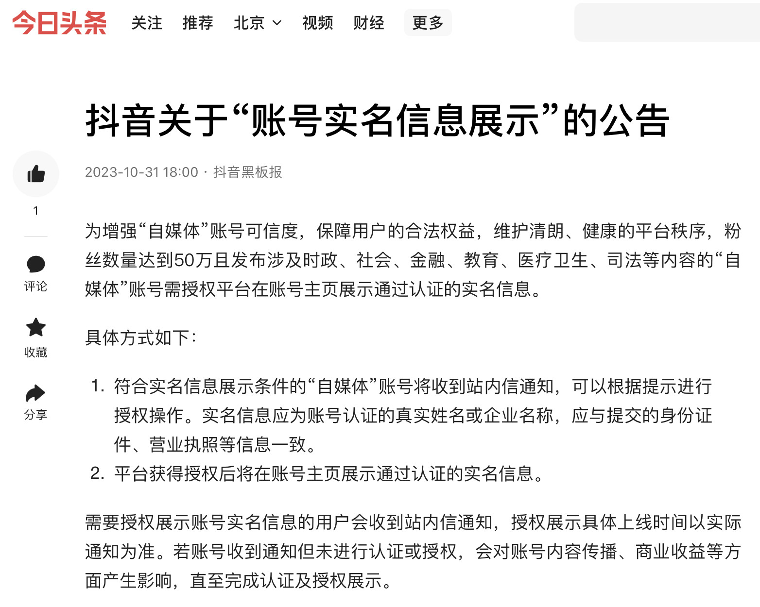 抖音发布公告称,“粉丝”数量达到50万且发布涉及时政、社会、金融、教育、医疗卫生、司法等内容的“自媒体”账号需授权平台在账号主页展示通过认证的实名信息。
