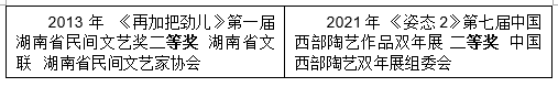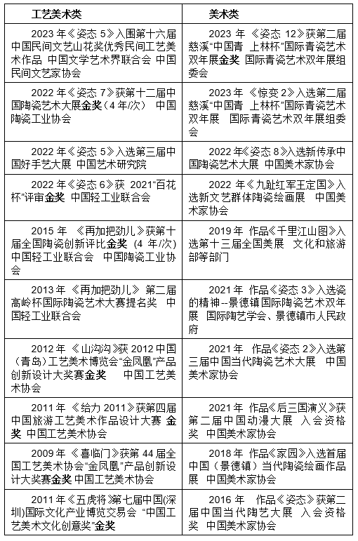 近年来先后入选中国美术家协会举办展览7项、入选各类国际陶艺双年展6次、获中国工艺美术协会金、银奖20余项、入选其它高规格赛事20余项。
