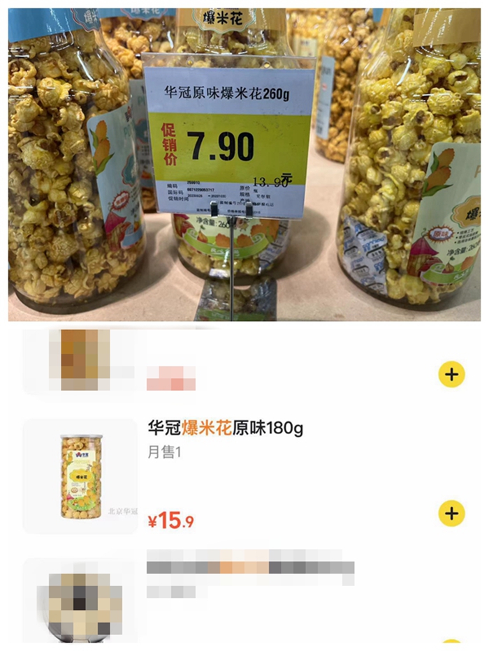 除了价格不一致,记者在调查中还注意到,商超还通过不同的包装来区分线上线下,例如某款爆米花在线下售卖260g原价13.9元现价为7.9元,线上根本不卖这一个包装,只有180g包装款,售价15.9元。显然线下价格性价比更高。