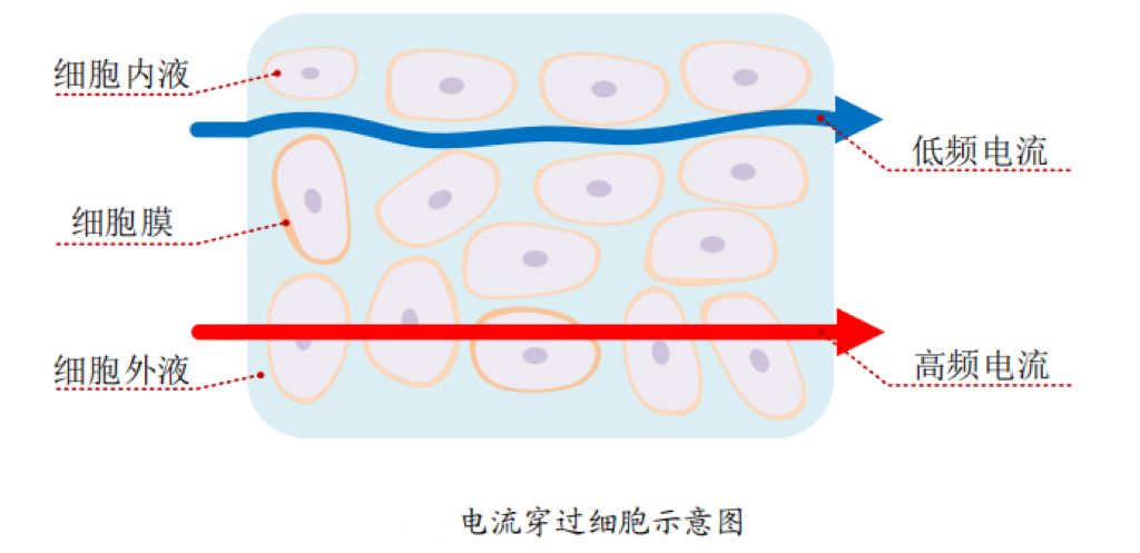 在低频电流通过时,细胞膜对电流具有阻碍作用,电流会直接从细胞外液流过,此时人体表现为电阻的特性;在通过高频电流信号时,细胞膜会呈现出电容的性质,电流将通过整个生物细胞组织,人体就反应为电阻、电容相互结合的复阻抗模型。这种生物组织被施加交流电信号时表现出的复杂阻抗信息,即是生物电阻抗。